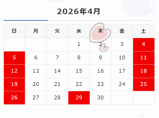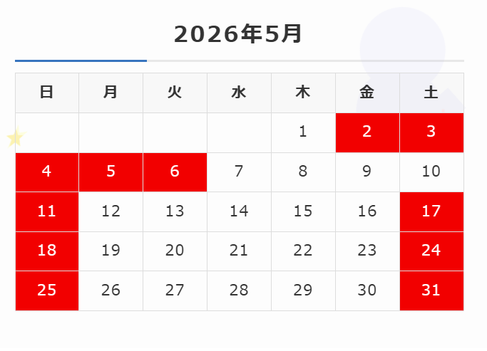 当店では、ゴールデンウィーク期間中はカレンダー通りの営業とさせていただきます。